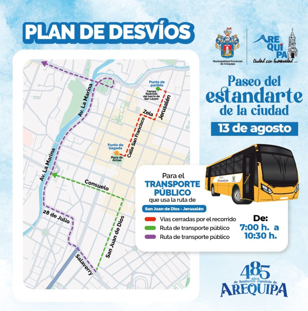 La Municipalidad Provincial de Arequipa informa a la ciudadanía que, con motivo de la tradicional ceremonia del Paseo del Estandarte de la Ciudad, este martes 13 de agosto, se aplicará un plan especial de cierre y desvío vehicular en el Cercado, con el objetivo de garantizar el orden, la seguridad y el normal desarrollo de la actividad.