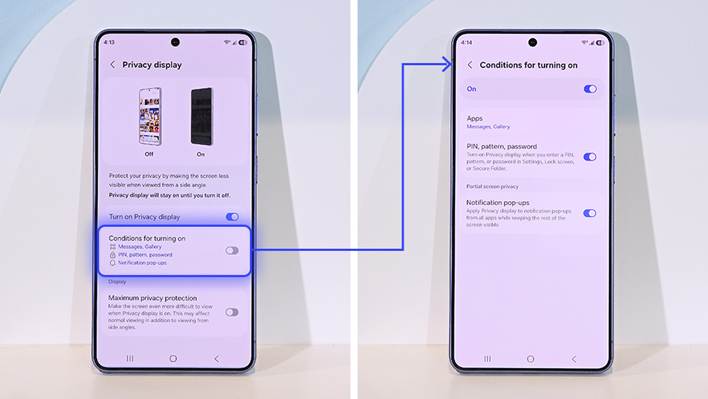 Los usuarios también pueden asignar la Privacy Display a la función de doble pulsación del botón lateral para mayor comodidad. Incluso cuando se ve de lado, el contenido permanece oculto, lo que resulta especialmente útil en el transporte público concurrido o en ascensores.